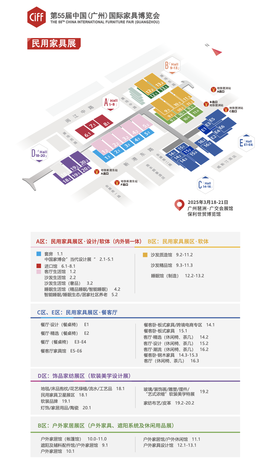 位于B区(9.1-13.1馆、10.0-11.0馆)的户外家居展区以“探索”为主题,囊括户外家具、遮阳产品、园艺装饰、烤炉火炉、露营产品等全品类,致力打造亚洲规模最大、专业度最高的户外家居展览。从2024年起,整体移师B区一楼,全新布局馆内外多区域,集结了等户外家居品牌矩阵,并重磅打造户外家具设计馆和户外主题特展,满足对户外休闲生活的所有想象与需求。
